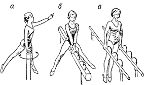 | Рис. 46. Упражнения для совершенствования положения тела партнерши в поддержках: а — на специальном вращающемся тренажере; б — на гимнастическом бревне; в — на брусьях |
