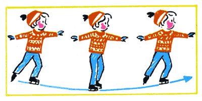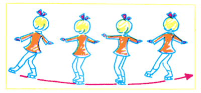 В фигурном катании при скольжении на ребре конька вперед или назад можно сделать переход в ходе движения на любом ребре конька — вперед или назад. Со всеми возможными переходами мы знакомиться не будем. Разберем некоторые из них. Научимся пока переходить с внутреннего ребра конька левой ноги, скользя вперед, на внутреннее ребро конька правой ноги (продолжая скользить вперед), ногу при этом можно ставить или рядом с опорной, или скрестно — спереди или сзади. С этого же внутреннего ребра левого конька можно перейти на наружное ребро правого,— и тоже ставя ногу или рядом с левой, или скрестив ее спереди или сзади с ней. С внутреннего же ребра конька левой ноги при скольжении вперед можно перейти на внутреннее ребро правого конька, на его наружное ребро и на скольжение назад.